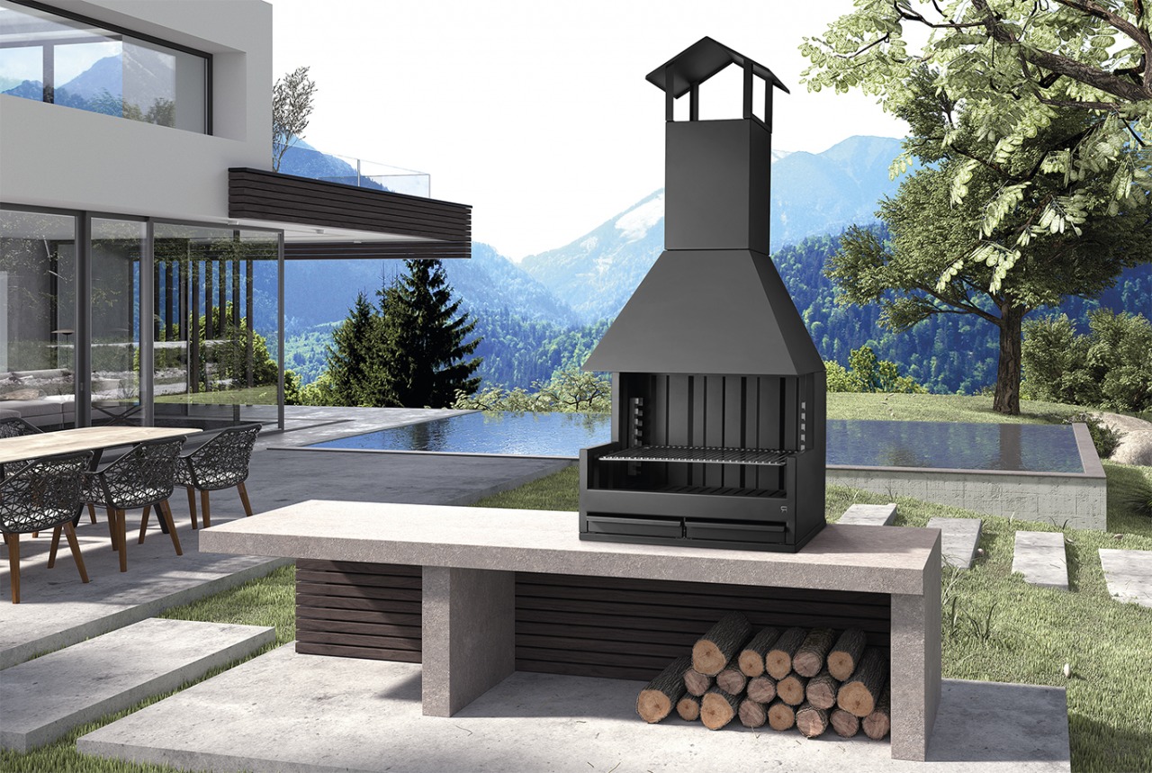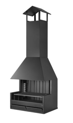 Barbacoa fabricada totalment en acer inoxidable. Reixa foc, campana i barret pintats amb pintura anticalòrica negra.