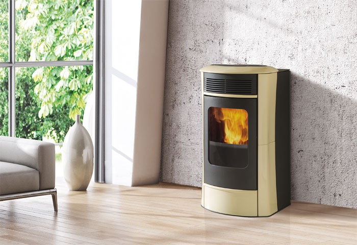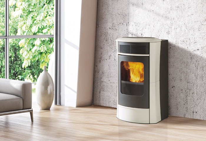 Estufa de pellet con frontal redondeado de cristal curvo. Disponible con perfiles, inserciones y parte superior de cerámica blanca nata, roja o gris.