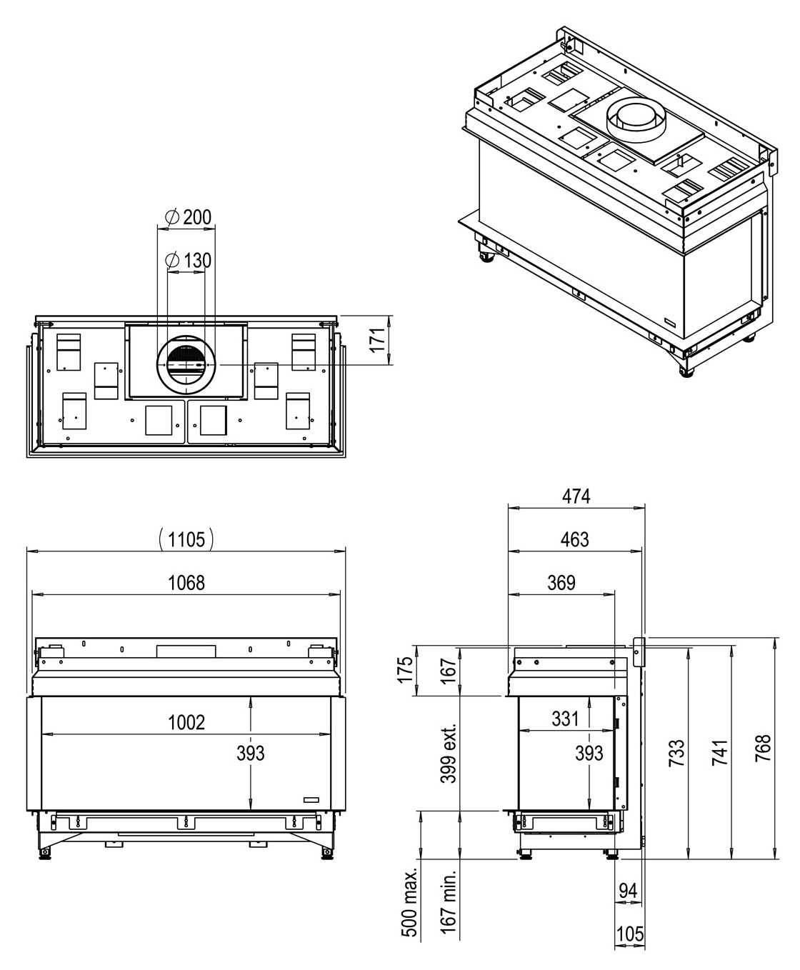 Llar estanca de gas. Tots els aparells de la línia Smart de Faber se subministren sense marc, amb efecte llenya, 2 reixetes per a sortida d'aire de convecció, porta per a registre i cremador Flat Burner.