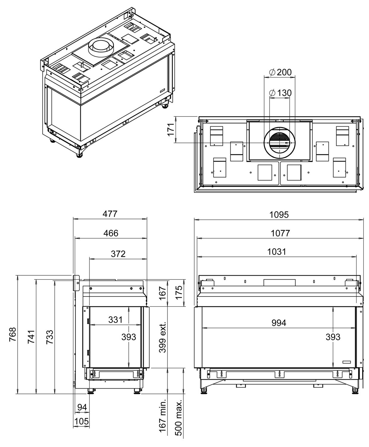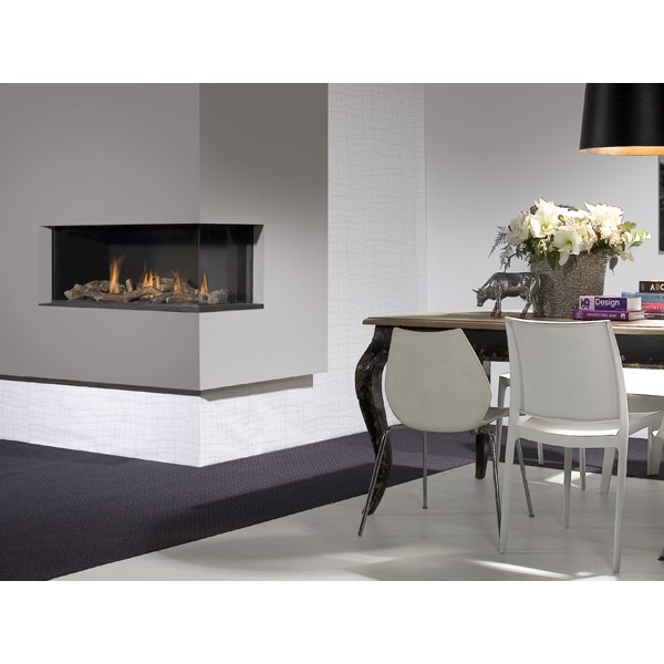 Llar estanca de gas amb visió frontal i lateral dret o esquerre . Tots els aparells de la línia Smart de Faber se subministren sense marc, amb efecte llenya, 2 reixetes per a sortida d'aire de convecció, porta per a registre i cremador Flat Burner.