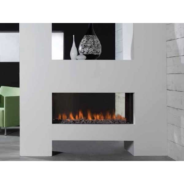 Xemeneia a gas de disseny llis i ample sense marc i visió de foc a dues cares oposades.