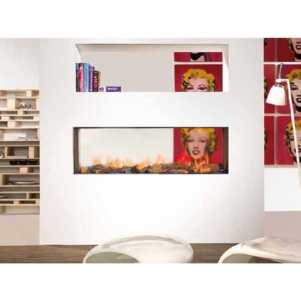 Bonica xemeneia a gas de disseny llis i ample sense marc i visió de foc a dues cares oposades.