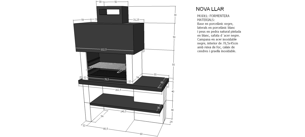 Barbacoa de diseño moderno y actual. Base de trabajo y laterales de placa de porcelánico y pies de piedra natural teñida.