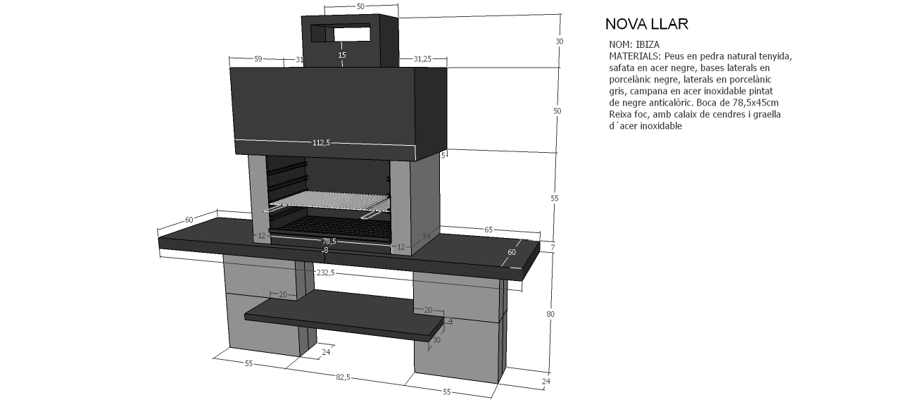 Barbacoa de diseño moderno y actual. Bases de trabajo y laterales de placa porcelánica y pies de piedra natural tintada.